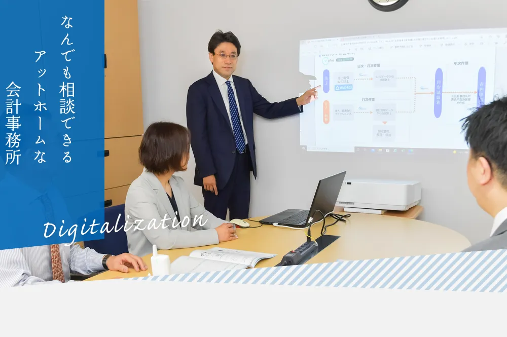 法人税・所得税の申告はもちろん、事業承継や相続税、デジタル化推進のお手伝いなど、経営者様の幅広いお悩みにご対応いたします。
